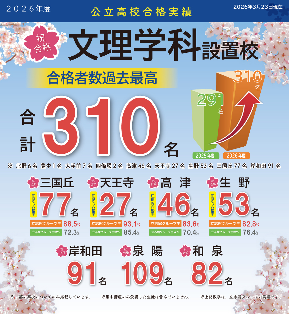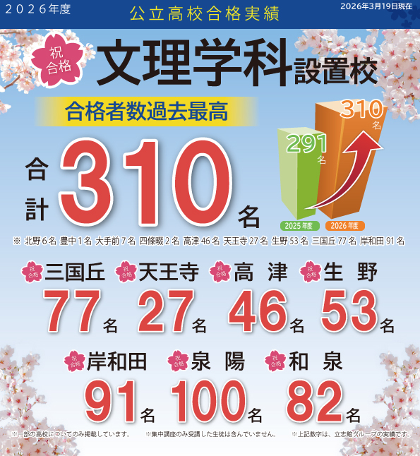 ※一部の高校についてのみ掲載しています。 ※私立高校の実績に内部進学の生徒は含んでいません。 ※集中講座のみ受講した生徒は含んでいません。 ※上記数字は、立志館グループの実績です。