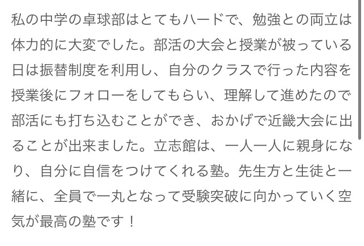 光明池地域はクラブ活動が盛んな地域でもありますが、立志館ゼミナールには、受講科目選択制や授業振替制度もありますので、クラブ活動や習い事との両立も可能です。実際、立志館ゼミナールに通う生徒のほとんどがクラブ活動をしており、運動部のキャプテン、吹奏楽部の部長など部をまとめる生徒や、学校外の野球やサッカーチームなどに所属する忙しい生徒も多数在籍しています。クラブ活動や習い事から学んだものは、今後の成長への大きな礎となります。一生懸命な生徒たちの充実した中学生活を立志館ゼミナールはしっかりとサポートしていきます。