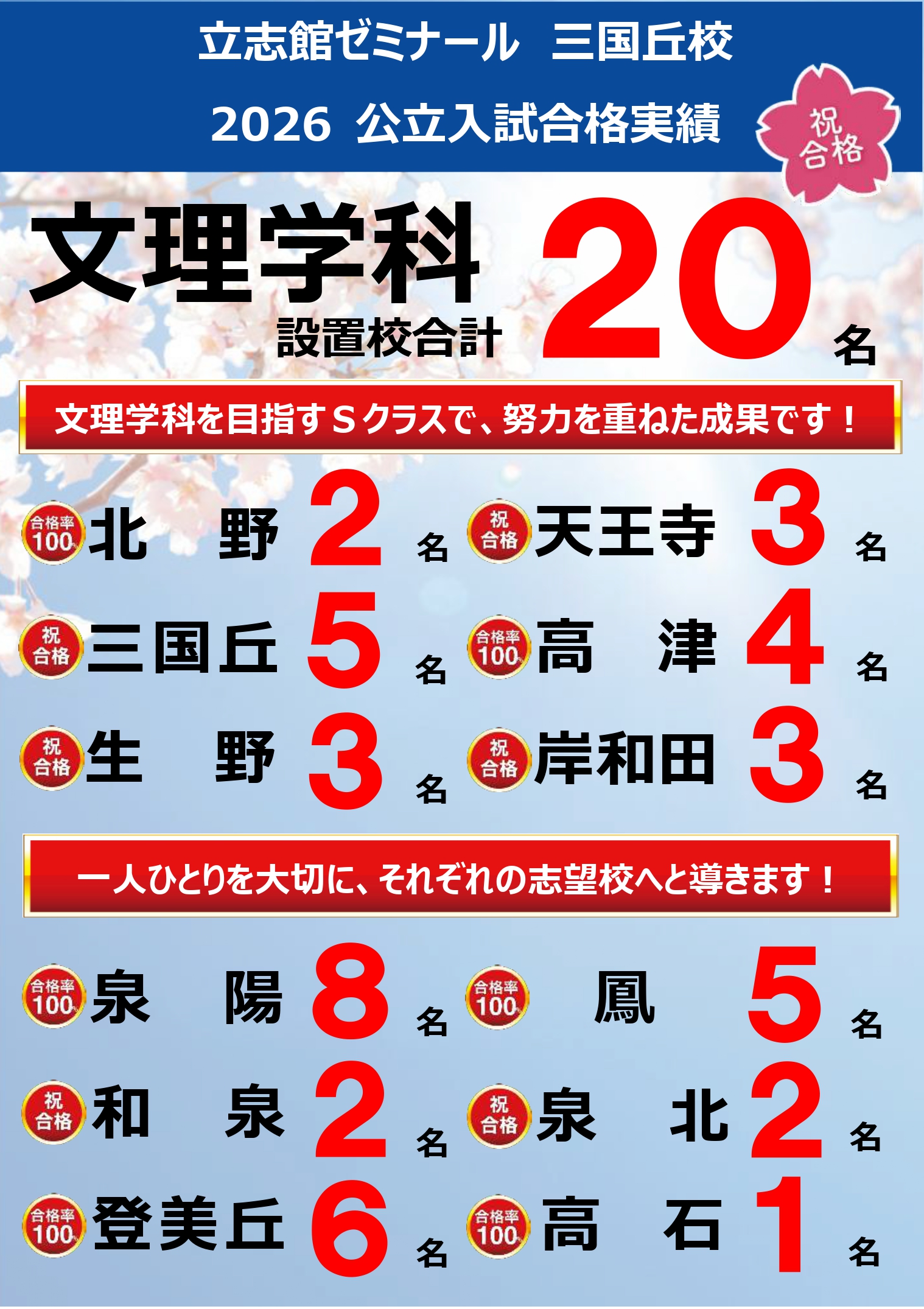 高校入試は「人生でこの時だけ」です。「もっと早くから頑張っておけばよかった」「もっと真面目に進路を考えておけばよかった」など、悔いの残る受験にだけはしてほしくない。我々はその一心で、日々生徒と接しています。ぜひ、立志館ゼミナール三国丘校で共に学び、「悔いの残らない受験」にしましょう!!