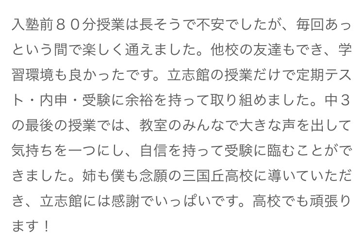 立志館ゼミナール初芝校を卒業する頃にはそう実感できるはずです。小さな目標から大きな目標へと一歩一歩、一緒に歩んでいける日々を、職員一同心よりお待ちしております。