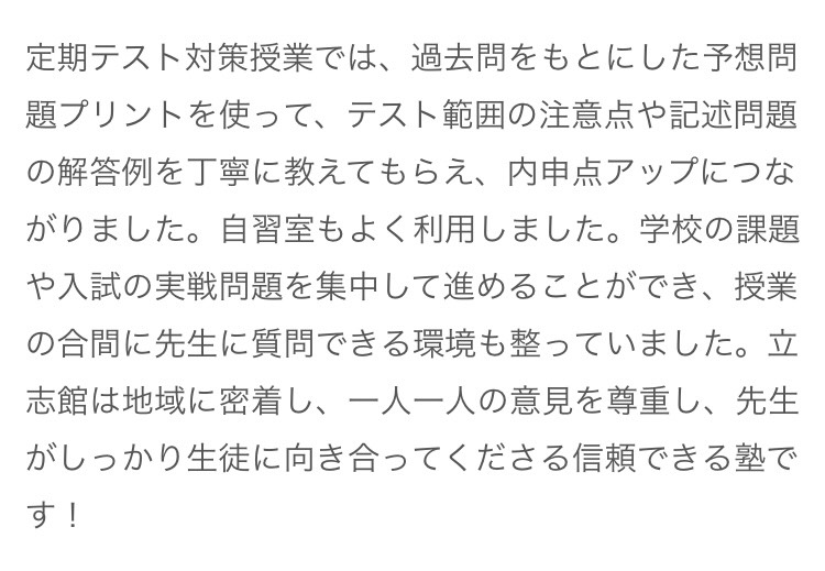 ここ数年、大阪府の入試問題は英語を中心に難易度が上がり、中学1・2年生の成績も内申点に反映されるようになり、早い段階からの総合力が求められるようになってきています。立志館ゼミナールでは定期テスト前には中学校別に時間割を組み替えて定期テスト対策授業を実施し、テスト範囲に即した授業を行いますので、多くの生徒が定期テストでもしっかり結果を残してくれています。また、学校の提出物も早い段階から計画的に取り組めるような働きかけを行い、テスト前にはテスト勉強に集中できる状況を作るようにしています。