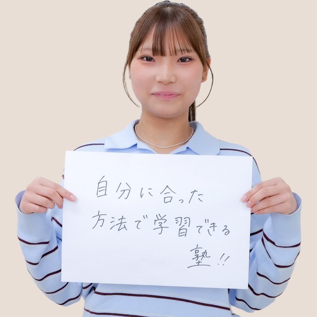 英検®2級合格までの道は先生と二人三脚で頑張りました。自習室を活用し、先生に学習状況や勉強内容を確認していただいたり、単語テストで力をつけたりと手厚く支えていただきました。二次試験の面接練習も丁寧に何度も行っていただき、合格につながりました。受験前に不安だった時、先生の励ましの言葉に勇気づけられ、自分を信じて臨むことができました。また先生方は話しやすく、日々の会話でも不安を和らげることができました!